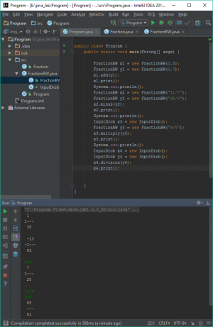 Создайте класс FractionRW, унаследуйте его от Fraction. Создайте конструктор, который принимает числитель и знаменатель, в нём необходимо вызывать конструктор родительского класса. Добавьте в него методы для ввода дроби с клавиатуры и для её вывода на экран. Создайте конструктор без параметров, который запрашивает ввод дроби с клавиатуры. Перепишите программу из прошлого урока с этим классом.