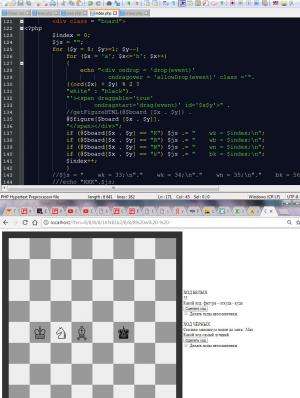 Научился: Как взаимодействуют PHP c JavaScript. Трудности: Выловить ошибку в chess.php, чтобы выводило правильные результаты. В позе на скриншоте выдавало неправильное количество ходов до мата. Поймал все же :) Теперь пишет мат в 33 хода) Да и ход первый делает правильно.