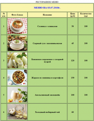 Сделать таблицу с ресторанным меню. Для каждого наименования вывести: №, фото, название, цену, форму для количества.