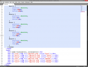 Научился: Располагать объекты с position: absolute; Трудности: Привести в движение объекты в космоме Кто хочет посмотреть мою работу в движении прошу заходить на http://tinklavimas.tekashnik.ru/kosmos.html