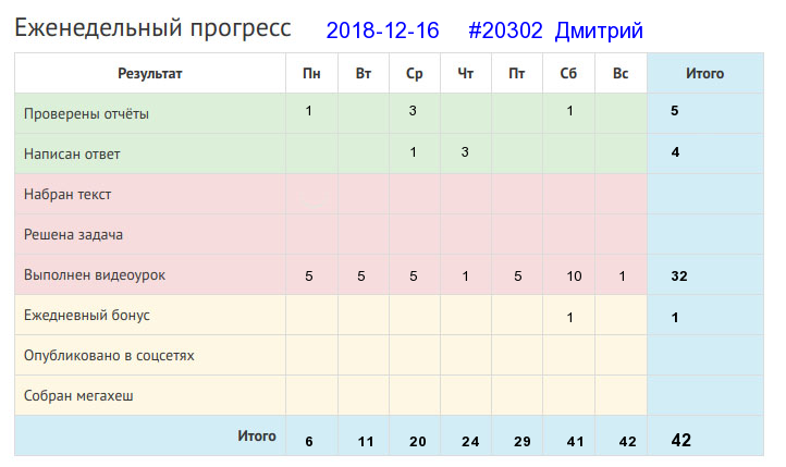 + Я выполнил 6 видеоуроков: 1 => «Нано-игры / Скорость реакции. Блок-схема» за 1 час. 14 мин. 2 => «Нано-игры / Скорость реакции. Три картинки по таймеру» за 1 час. 41 мин. 3 => «Нано-игры / Скорость реакции. Алгоритм и рекорд» за 1 час. 52 мин. 4 => «Нано-игры / Игра Цифры» за 17 час. 49 мин. 5 => «Нано-игры / Бот для Цифр» за 1 час. 39 мин. 6 => «Карточки памяти / Неуловимая птичка» за 53 мин.
