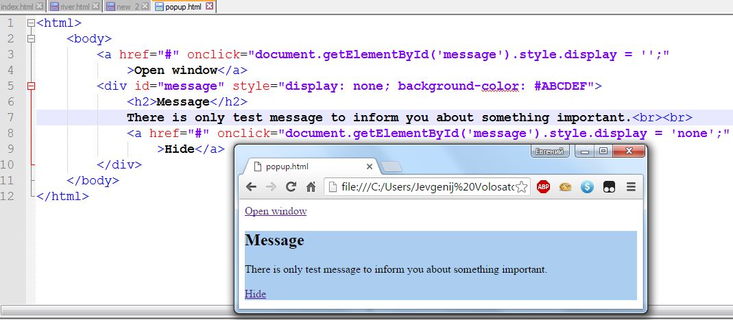 текстовый блок на экране, с использованием JavaScript.